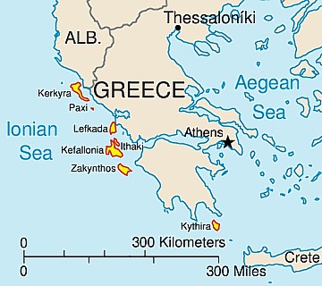 The Ionian Islands are: Corfu (Korfu, Kerkyra), Ithaki, Kefalonia (Cefalonia), Kythira, Lefkada (Lefkas), Paxi and Zakynthos (Zante).